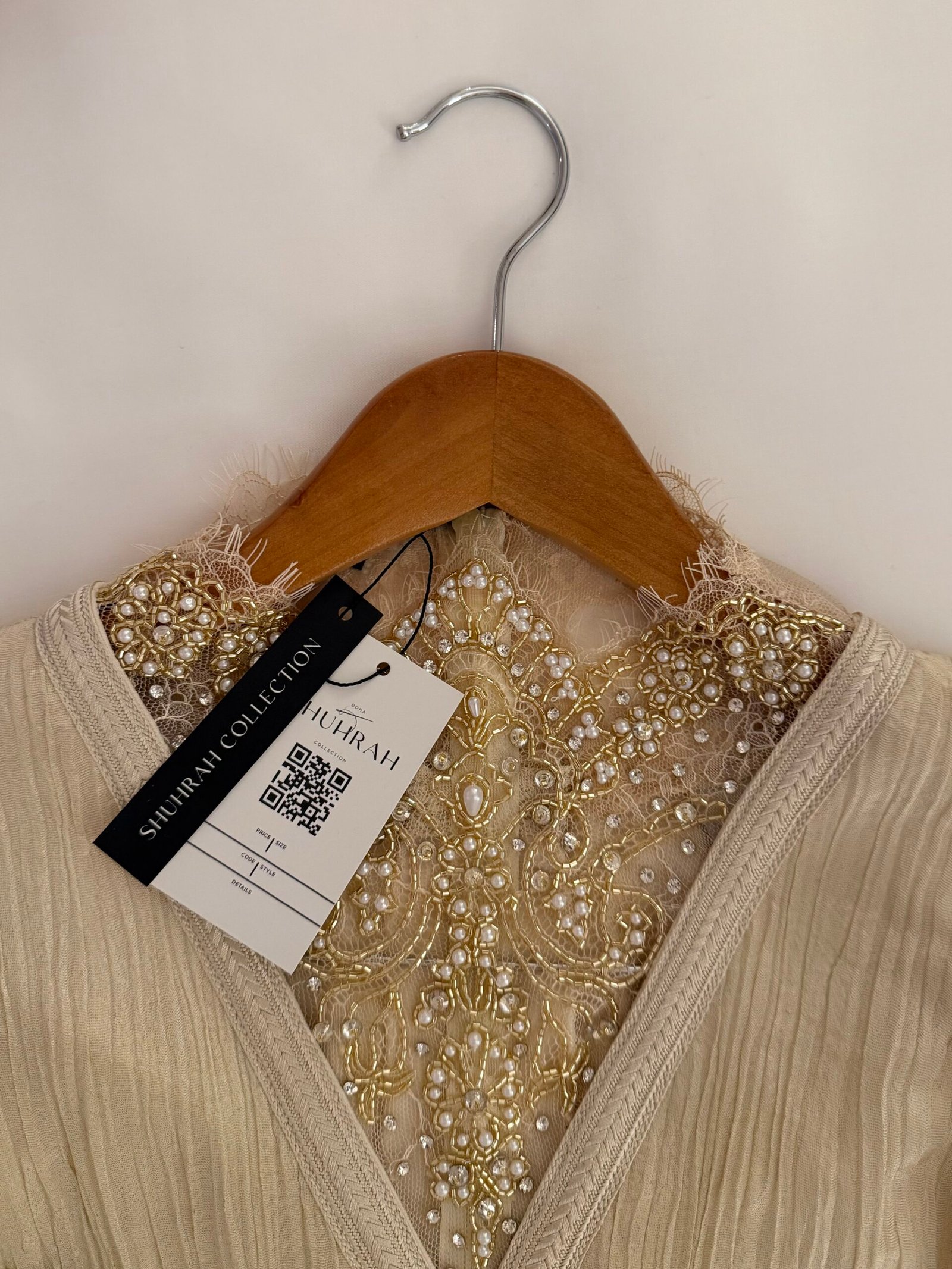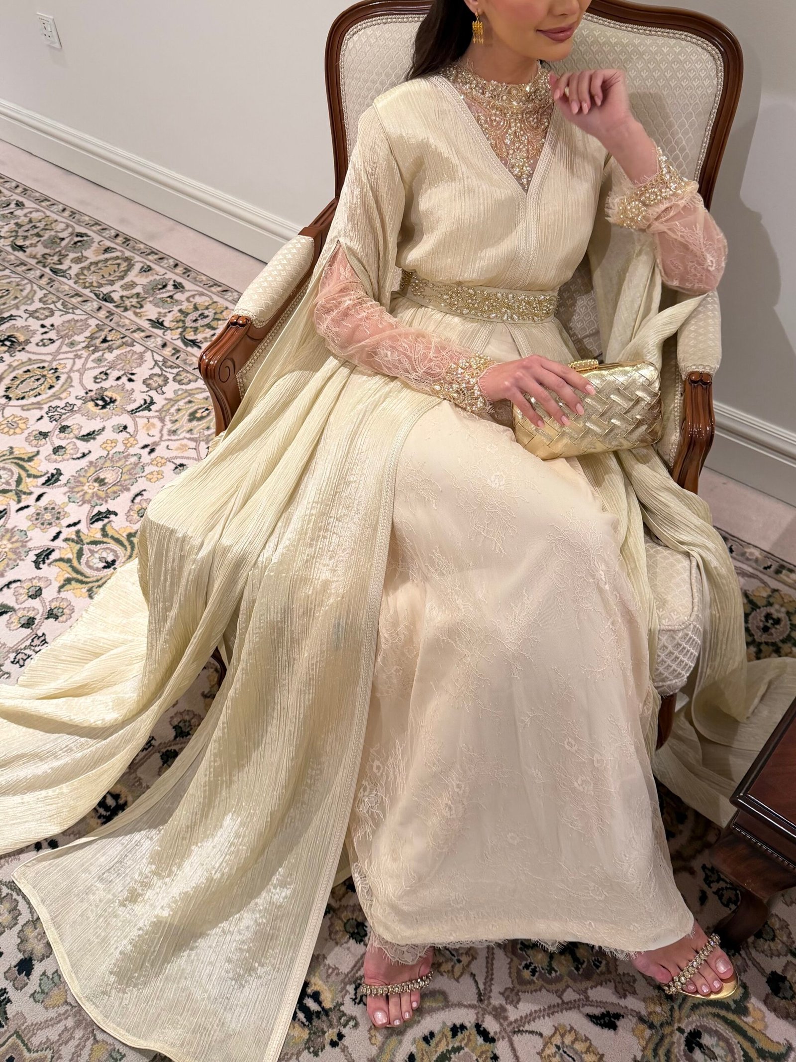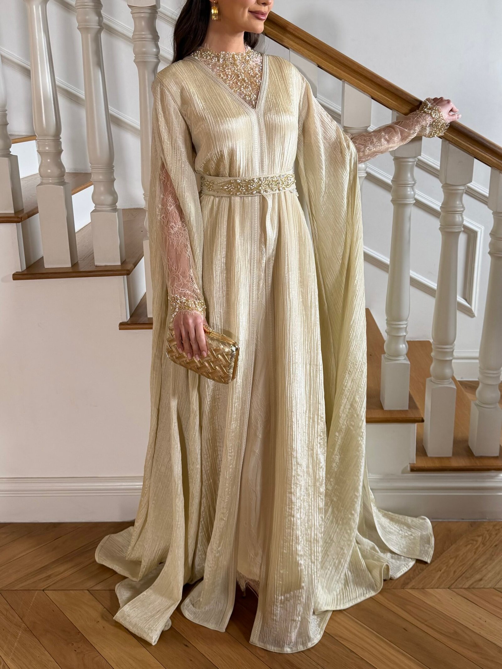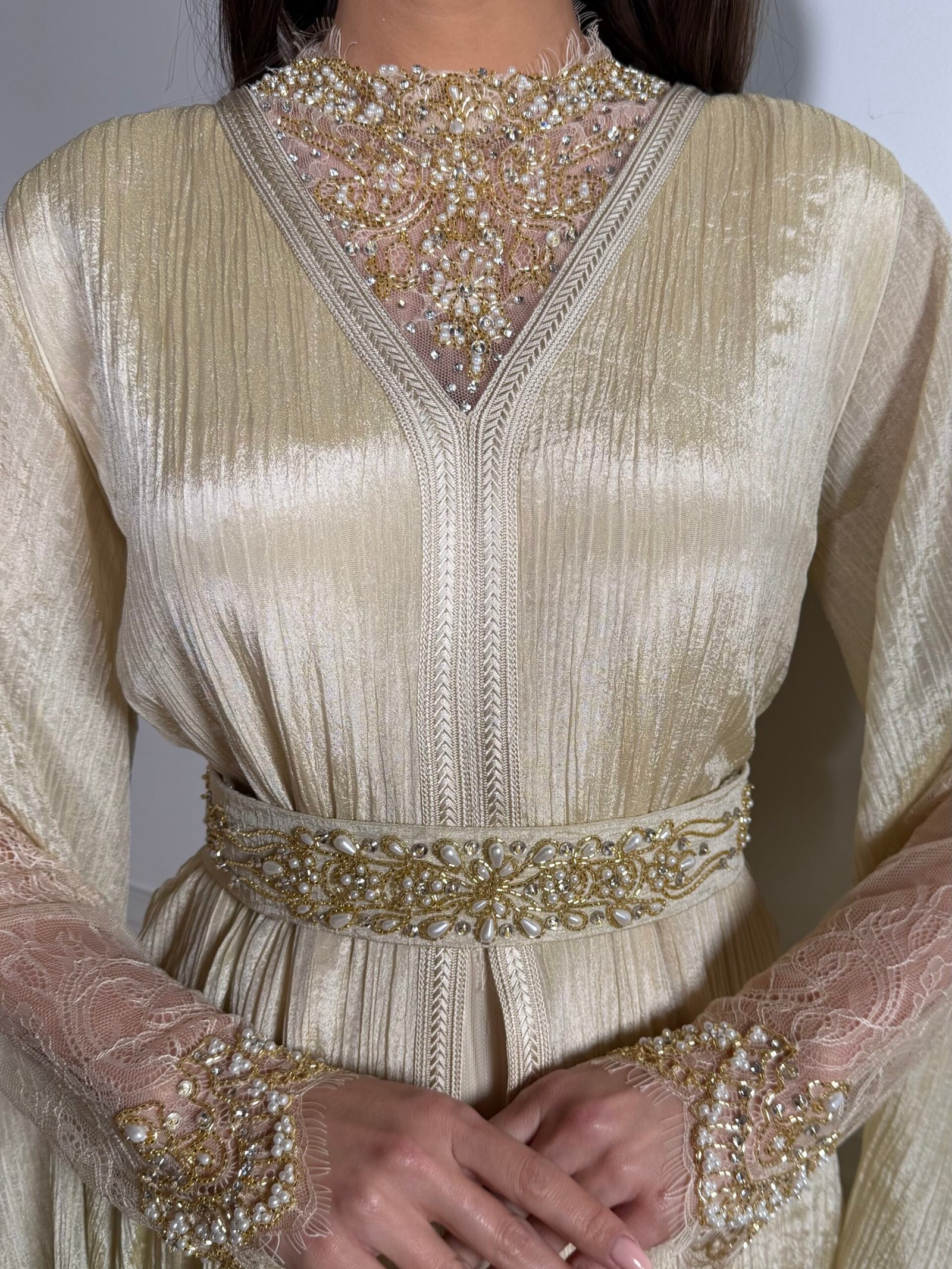 Luxurious caftan made of crushed fabric and premium French lace, featuring hand embroidery with crystals, beads, and pearls.