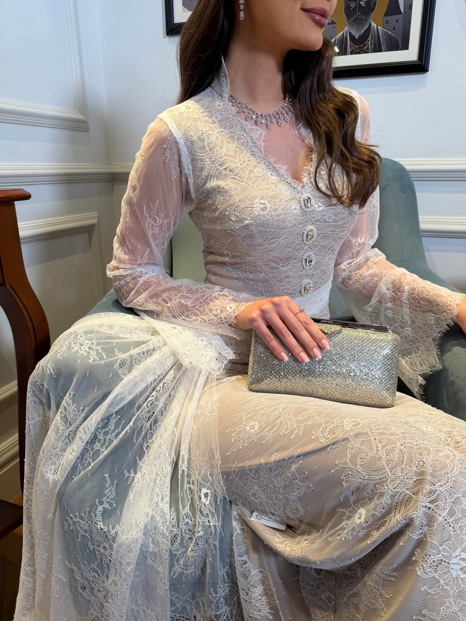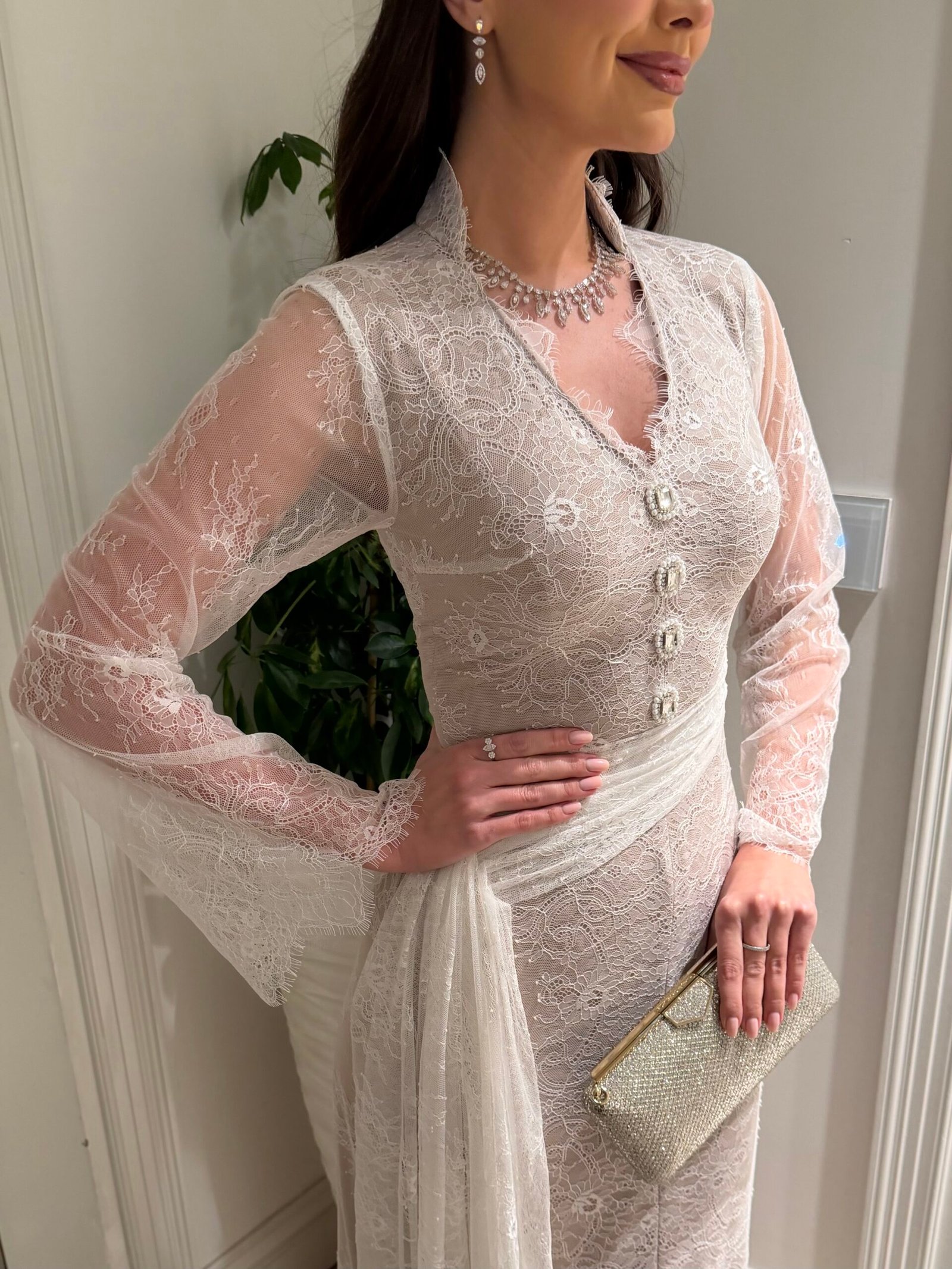 A dress made of luxurious French lace, lined with beige fabric and adorned with pearls and crystals. The dress is suitable for all occasions.